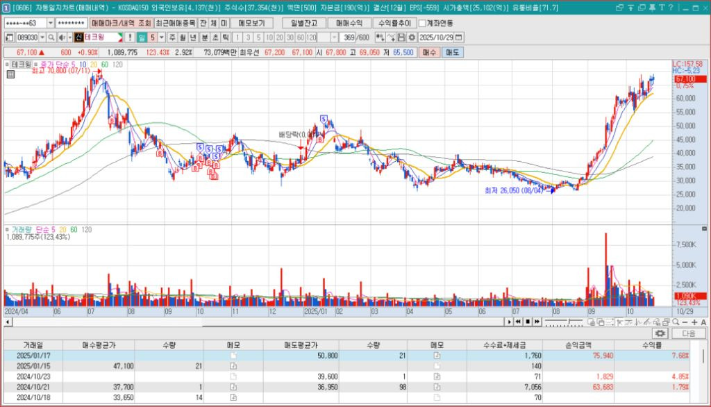 💰 실제 매매일지 공개 | 📉 테크윙 33,000원 평단 매도 후 67,000원 놓친 썰