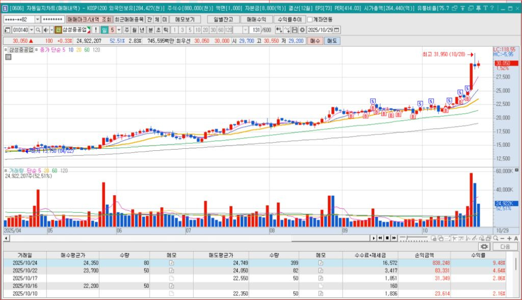 ▲ 실제 내 계좌 캡처: 삼성중공업 22,000원 평단, 10% 수익에 전량 매도 → 다음날 30,000원 급등 목격